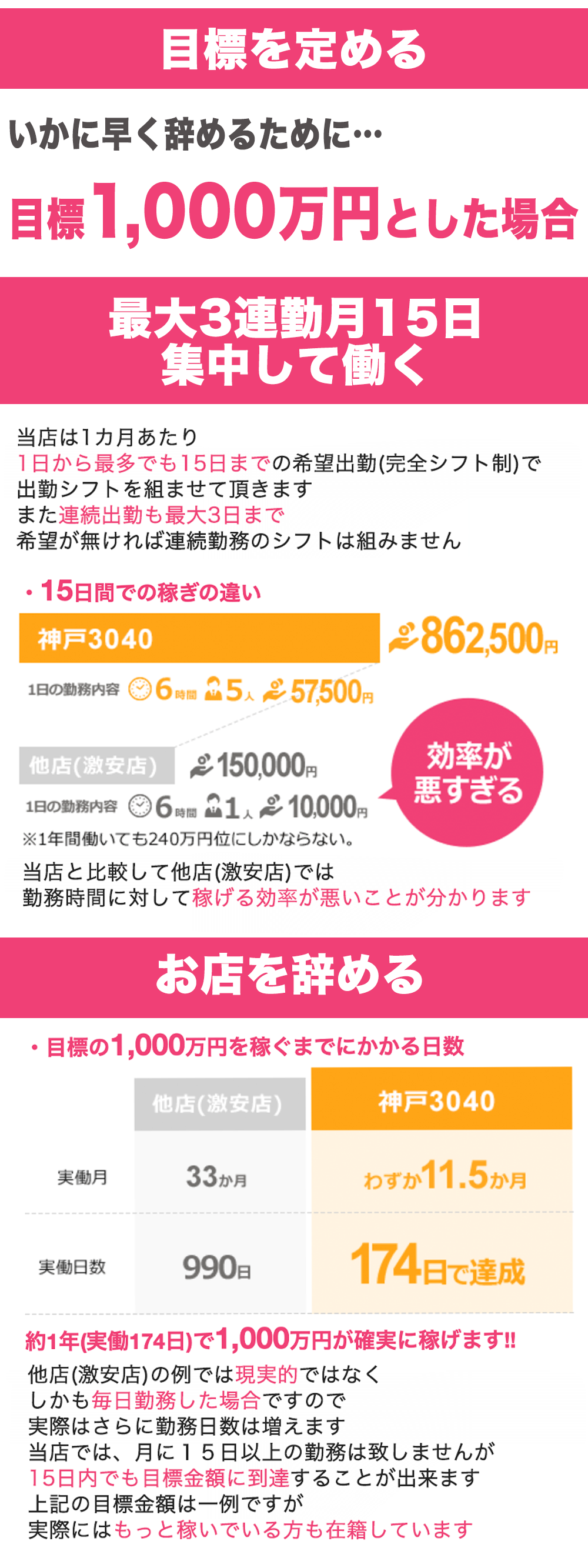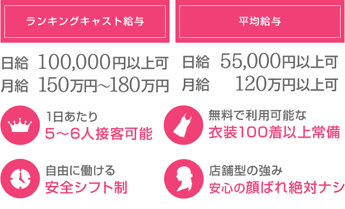 当店は最大3連勤、月15日以上の勤務はさせません。出勤日数が一カ月で15日以上になってしまうと毎日出勤してる分、稼げてない=人気が無い=サービスが悪いのかも?と誤った印象を持たれてしまう恐れが、かなりの確率で高くなります。その様な誤った印象をお客様が持たれないような出勤体制でお客様が実際にお会いになった女性の接客・サービスを純粋に評価をしていただきたいと考えています。